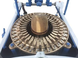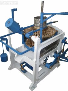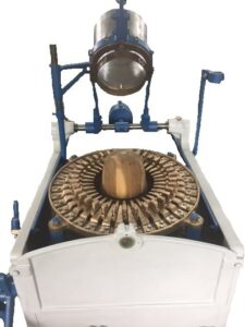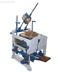 On this machine, head and crown the head and edge of hat bodies from rabbit and „haar “hair in the wet procedure. It is stable and built solidly and has proved itself very well. On their margin widths can be processed up to 400 mm. Included are 9 pieces oval rings for the hat size 53 to 61 and a pivoting shower (or, on request, a shower with drawbar). The machine has 36 clambs, that hold the brim on all sides. The hat is formed with a consisting of 36 disc expanding head.